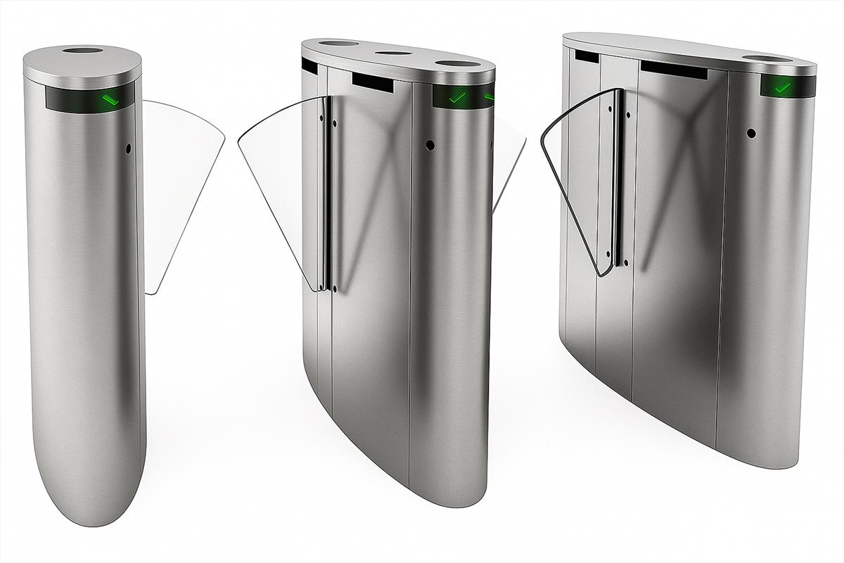 Flap Barrier: phù hợp cho sảnh văn phòng hoặc cao ốc, đóng mở nhanh ~0,5s.